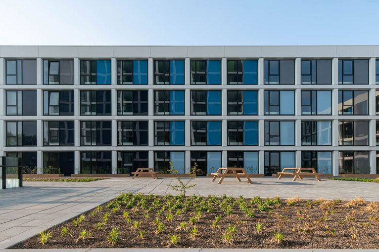 The U-shaped complex features a painting by the well-known Groningen artist Werkman on its façade, boasts a courtyard garden with sports fields adjacent to the Reitdiep, as well as space for essential hospitality venues. Students are able to choose from studios ranging between 20 and 40 m² in size. Truly high-flying students also have the option of moving into a several two-storey apartments at the very top, featuring stunning views. The complex was constructed to be earthquake resistant in consultation with NAM and with the expertise of Geveke Bouw.